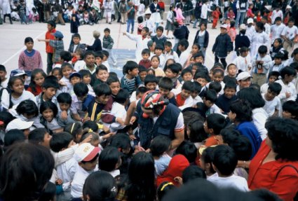 Solo el primer día en La Paz. Había contactado con una ONG para que me fueran a recoger al aeropuerto y no aparecieron. Me encontré solo en el aeropuerto con un dolor de cabeza impresionante a causa de la altitud, con los taxistas allí parados mirándome con ojos poco tranquilizadores. Monté a Quirlig y bajé a La Paz; busqué una pensión y me tiré en la cama; pasé una noche terrible. Fue el peor momento de todo el viaje. Al día siguiente fui al consulado y hablé con la encargada de asuntos culturales; le pregunté donde podía hacer mi espectáculo y me llevó a un colegio donde me dieron alojamiento. Y lo mejor de todo es que el director, un cura salesiano de setenta y tantos años, era payaso aficionado. Aquél golpe de suerte lo interpreté como una buena señal.